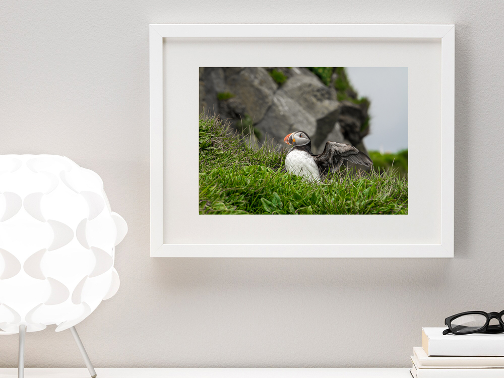 Tirage photographique encadré d'un macareux moine, prise de vue par le photographe et guide français en Islande Jean-Yves Petit